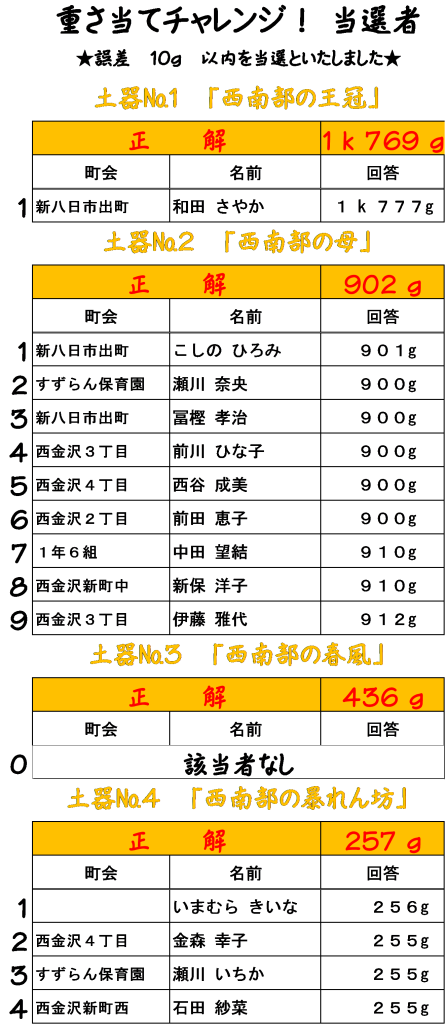 「R7せいなんぶ文化祭」 での「重さ当てチャレンジ!」の当選者は以下の方々です。
